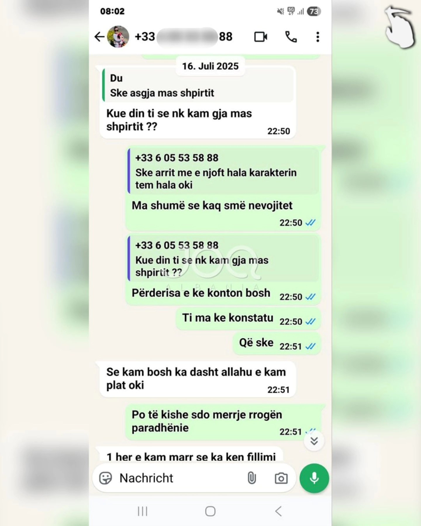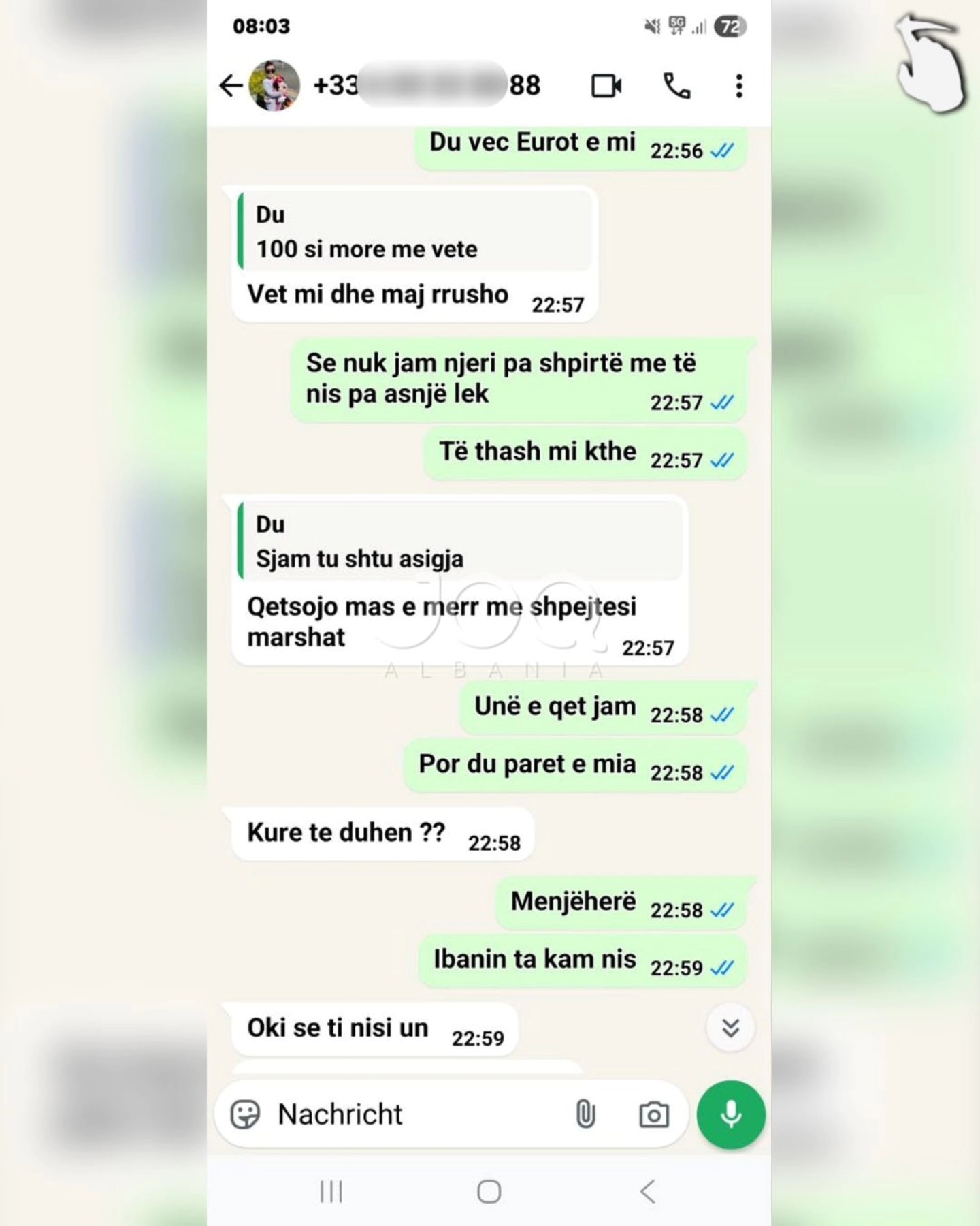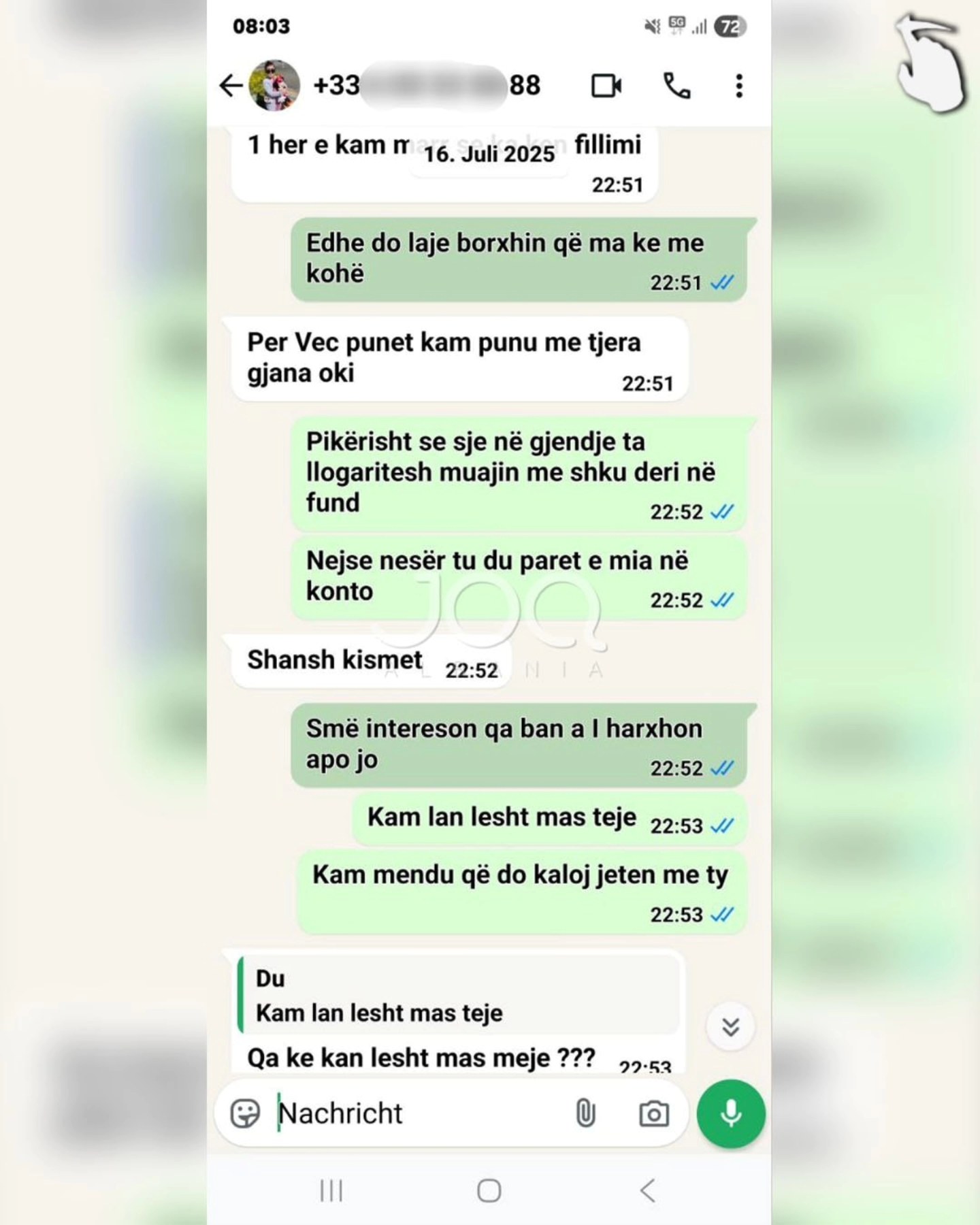 “Përshëndetje JOQ, kam njohur një zotëri nëpërmjet nënës së tij, Meliha Shkreli. Ajo ma këshilloi djalin e saj për njohje serioze. I besova dhe mendova që nuk do të kisha zhgënjim. Kur pashë që muajt kaluan dhe ai nuk po ndryshon, edhe eurot e mia nuk po mi kthen, atëherë u tërhoqa. Ai quhet Gazmend Zuesi, 37 vjeç, nga Shkodra, i divorcuar me një vajzë 6-vjeçare dhe jeton në Francë. Unë jetoj në Gjermani. Më pas i luta disa herë këtij dhe nënës së tij për borxhin që më kishte. Nënës së tij i tha: “Ju jeni marrë vesht, unë vetëm ju kam prezantuar.” Kurse ai më rren duke thënë që do t’ia jap, por deri më 10.02.2025 nuk mi ka kthyer eurot e mia. Janë 600 euro që më ka. Duke parë që ju jeni një faqe shumë e njohur, mendova ta ndaj këtë problem që ju ta publikoni në internet”.