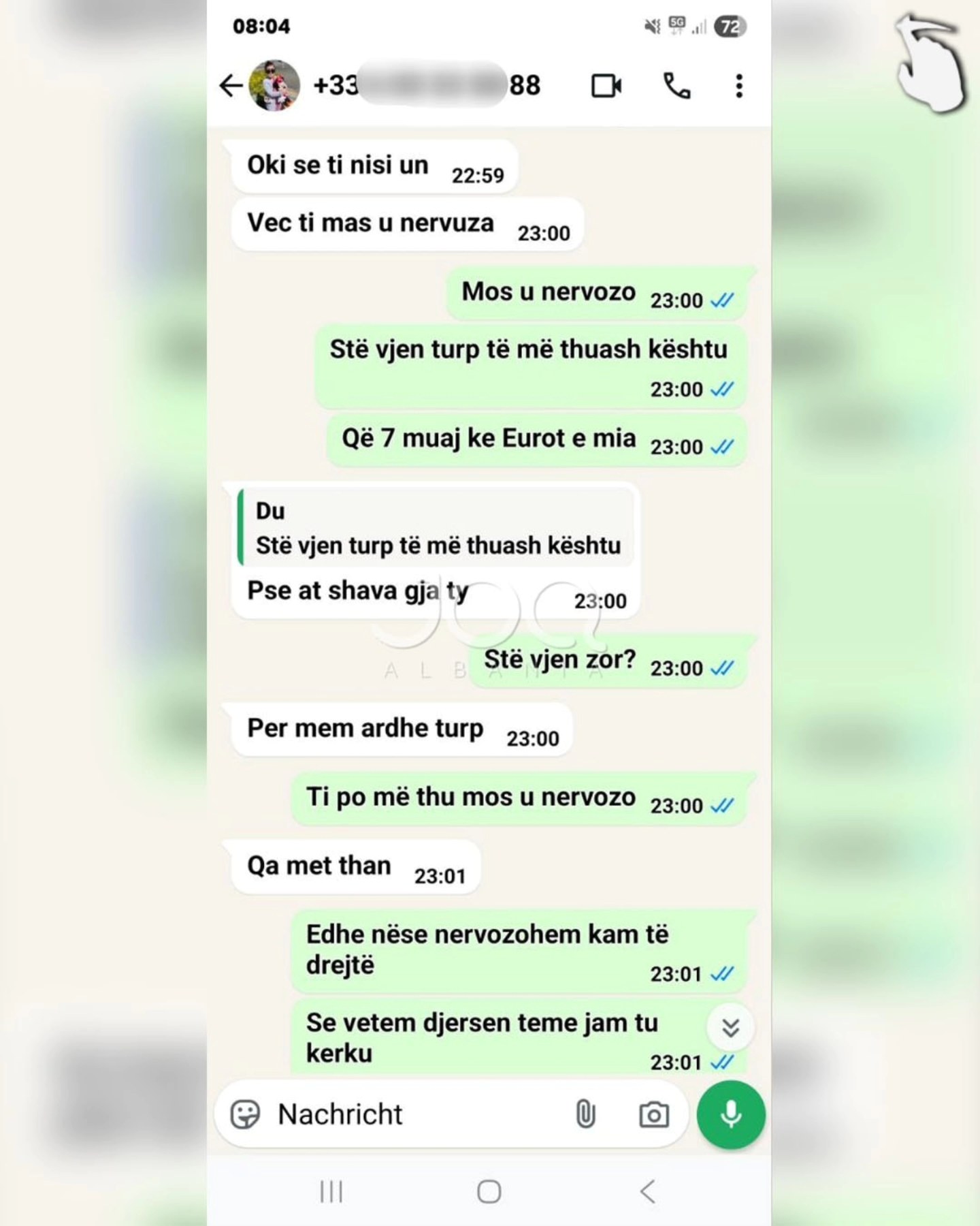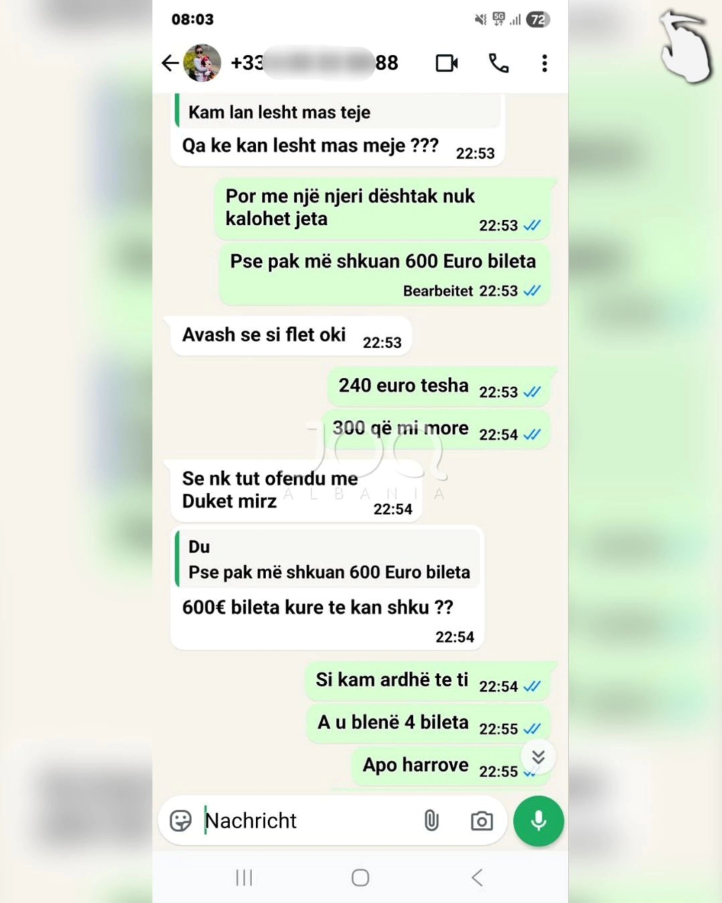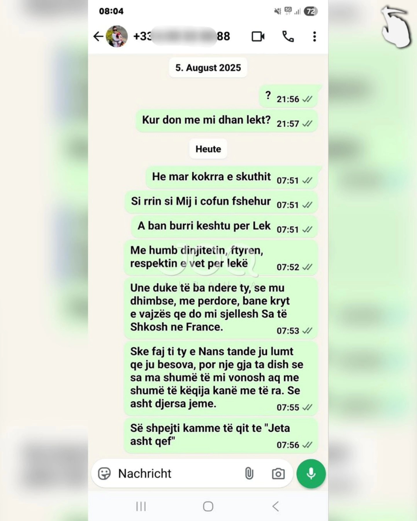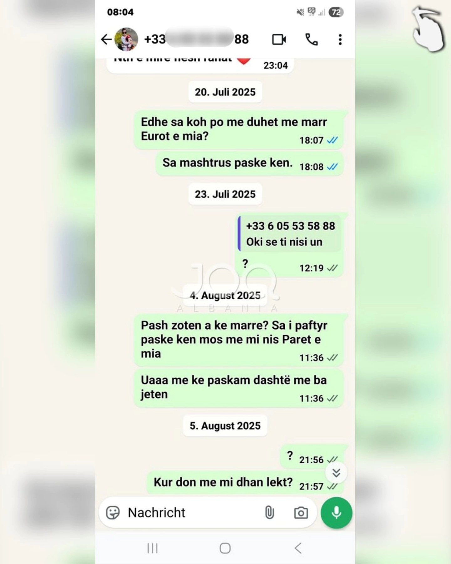 “Përshëndetje JOQ, kam njohur një zotëri nëpërmjet nënës së tij, Meliha Shkreli. Ajo ma këshilloi djalin e saj për njohje serioze. I besova dhe mendova që nuk do të kisha zhgënjim. Kur pashë që muajt kaluan dhe ai nuk po ndryshon, edhe eurot e mia nuk po mi kthen, atëherë u tërhoqa. Ai quhet Gazmend Zuesi, 37 vjeç, nga Shkodra, i divorcuar me një vajzë 6-vjeçare dhe jeton në Francë. Unë jetoj në Gjermani. Më pas i luta disa herë këtij dhe nënës së tij për borxhin që më kishte. Nënës së tij i tha: “Ju jeni marrë vesht, unë vetëm ju kam prezantuar.” Kurse ai më rren duke thënë që do t’ia jap, por deri më 10.02.2025 nuk mi ka kthyer eurot e mia. Janë 600 euro që më ka. Duke parë që ju jeni një faqe shumë e njohur, mendova ta ndaj këtë problem që ju ta publikoni në internet”.