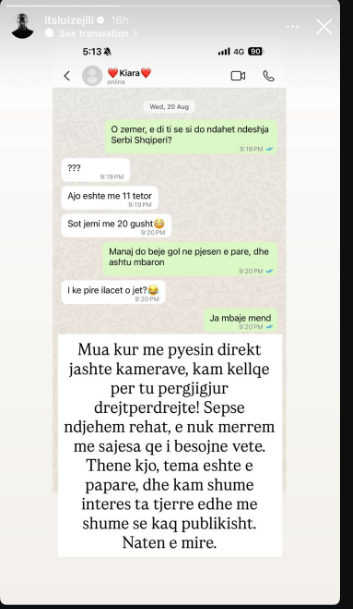 Ndërkohë lidhur me këtë reagim të Memës, ka bërë një postim ironizues partneri i Kiarës, këngëtari Luiz Ejlli. Ky i fundit ka publikuar një “mesazh” me Kiarën, ku ajo e pyet për ndeshjen Serbi-Shqipëri.