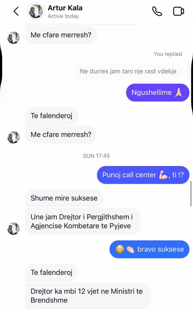 Pasi drejtori “Rilindas” i ka dërguar ftesë për miqësi në “Instagram”, e ka falenderuar për pranimin e ftesës. Duke u mburrur se është drejtor prej më shumë se 12 vitesh, dhe se “nuk di të bëjë punë tjetër veçse drejtor”, Arturi i është prezantuar vajzës.