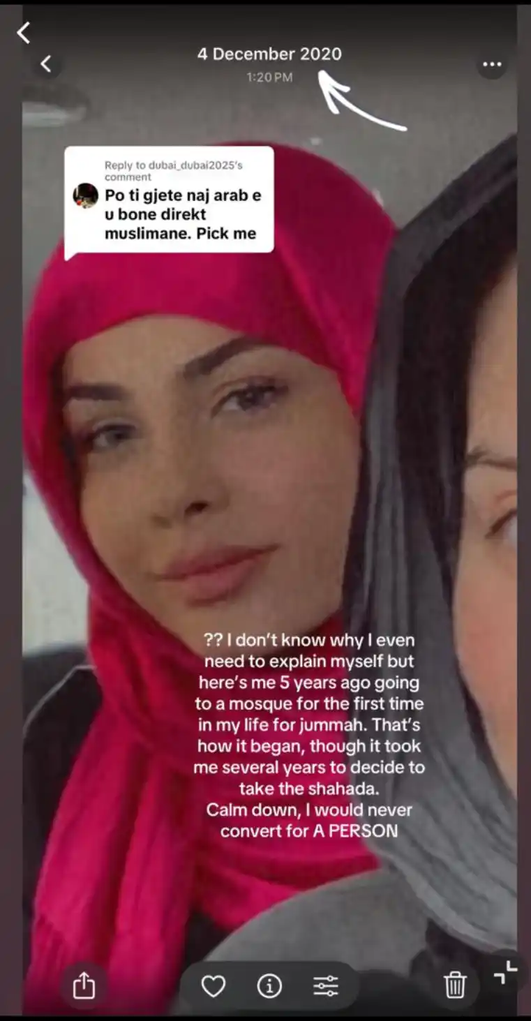 “Qetësohuni, kurrë nuk do konvertohesha për dikë,”, është shprehur Aleksia, duke shtuar se udhëtimi i saj shpirtëror ka nisur pesë vite më parë, kur për herë të parë kishte marrë pjesë në faljen e xhumasë.