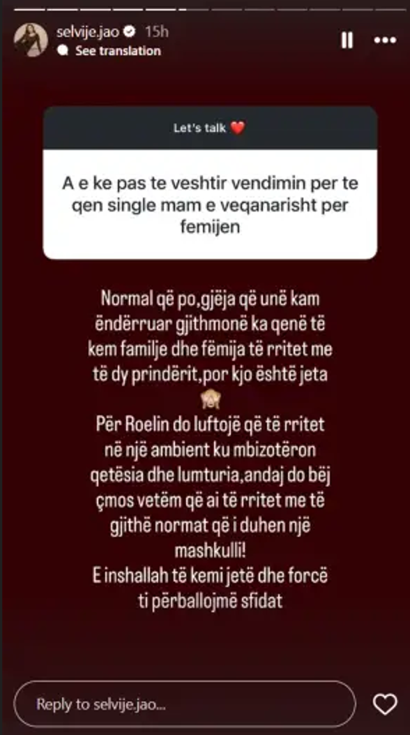 Ndërsa Selvije Jao u përgjigj: “Normal që po, gjëja që unë kam ëndërruar gjithmonë ka qenë të kem familje dhe fëmija të rritet me të dy prindërit, por kjo është jeta.