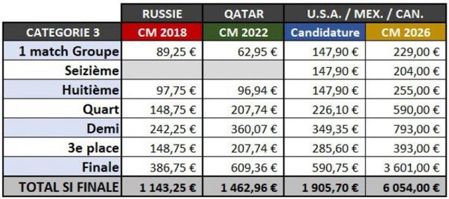 Pas arritjes së ekipit kombëtar francez në finale, ashtu si në vitet 2018 dhe 2022, do të kushtonte 6.050 euro në kategorinë 3, 9.919 euro në kategorinë 2 dhe 14.281 euro në kategorinë 1. “Është një turp për futbollin”, revoltohen Trendet e çmimeve gjatë edicioneve të fundit të Kupës së Botës