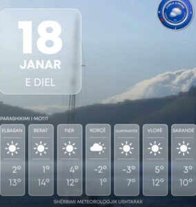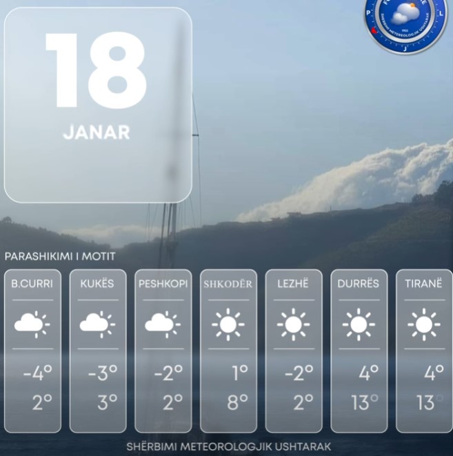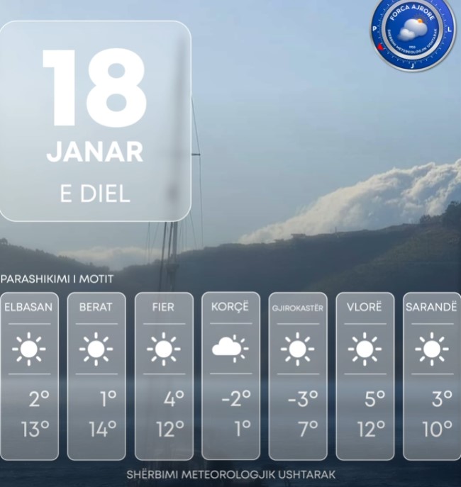 Për ditën e sotme vendi ynë do të ndikohet nga kushte atmosferike të qëndrueshme. Moti parashikohet i kthjellët në pjesën më të madhe të territorit si dhe alternime vranësirash mesatare deri të dendura, më të theksuara në zonën veriore e lindore të vendit. Era do të fryjë me drejtim verilindje– juglindje, me shpejtësi mesatare 7 m/s, përgjatë vijës bregdetare dhe zonat luginore era me shpejtësi deri në 14 m/s. Valëzimi në det do të jetë i forcës 1-2 ballë.