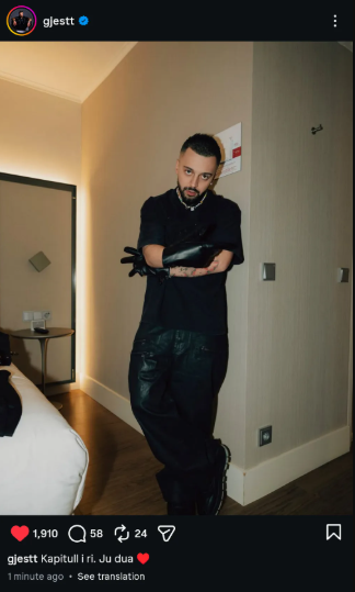 Në mes të këtij suksesi, Gjesti ka publikuar një foto të re në Instagram, ku shfaqet me një stil të veçantë (me dorashka lëkure dhe veshje të zezë). Por ajo që ka marrë më shumë vëmendje është mbishkrimi i fotos: