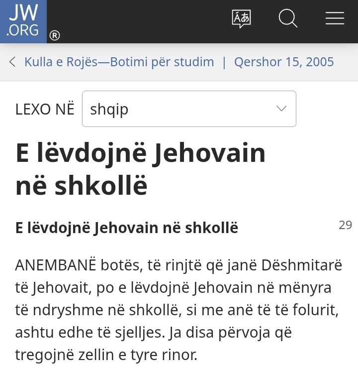 ANEMBANË botës, të rinjtë që janë Dëshmitarë të Jehovait, po e lëvdojnë Jehovain në mënyra të ndryshme në shkollë, si me anë të të folurit, ashtu edhe të sjelljes…”