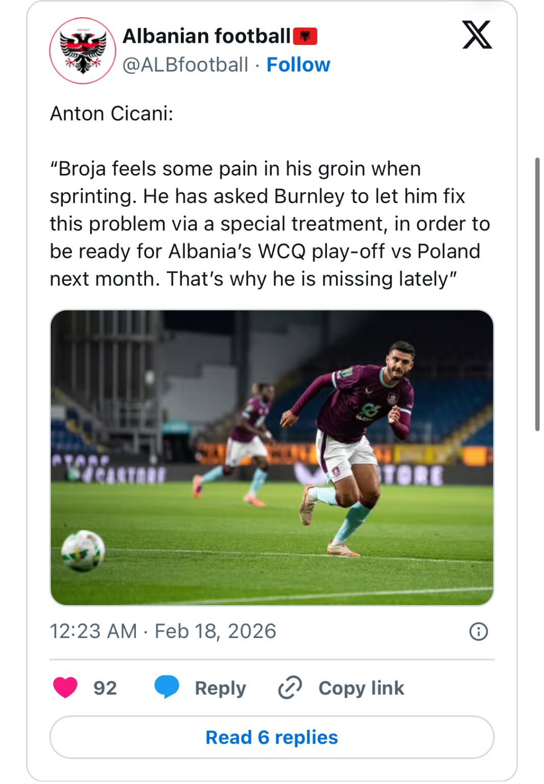 Por nga ana tjetër sulmuesi pritet të marrë gjithë ngarkesën e duhur për t’u rikuperuar në kohë dhe për të qenë “on-top” për sfidën e 26 marsit. Gjithsesi mbetet të shihet se çfarë do të ndodhë në ditët e ardhshme, teksa te Kombëtarja “kryqëzojnë gishtat” për të.