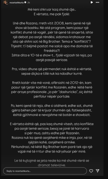 Rezarta Shkurta ka reaguar në mënyrë publike në rrjete sociale, duke hedhur dritë mbi atë që sipas saj ka ndodhur realisht mes saj dhe Rozanës. Ajo tregon se “konflikti” që përflitet ka ndodhur në vitin 2008, në një program televiziv, dhe ishte thjesht një debat banal mbi… pastat! Po, po, pastat me salcë apo me domate të freskëta. Por ajo që ndezi më shumë kureshtjen ishte pikërisht pjesa që ka të bëjë me “dashurickat”, një temë që gjithmonë bën bujë në botën e showbizit.