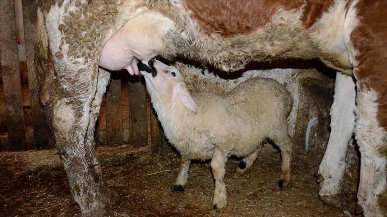 Në Sarıkamısh të qytetit Kars në Turqisë, lopa e quajtur “Sarıkız” po ushqen me gji një qengj, nëna e të cilit ngordhi një javë pasi…